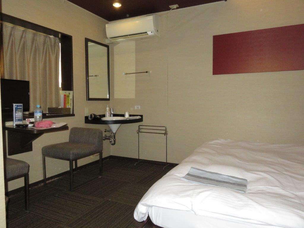 部屋は別館で物凄く古さを感じました。鍵でドアを開けると、部屋は1人にしては十二分な広さでしたが、え~風呂がないの~とちょっとガッカリ。私は部屋の風呂で頭を洗い顔を洗う派です。ま~安いから仕方がない。
